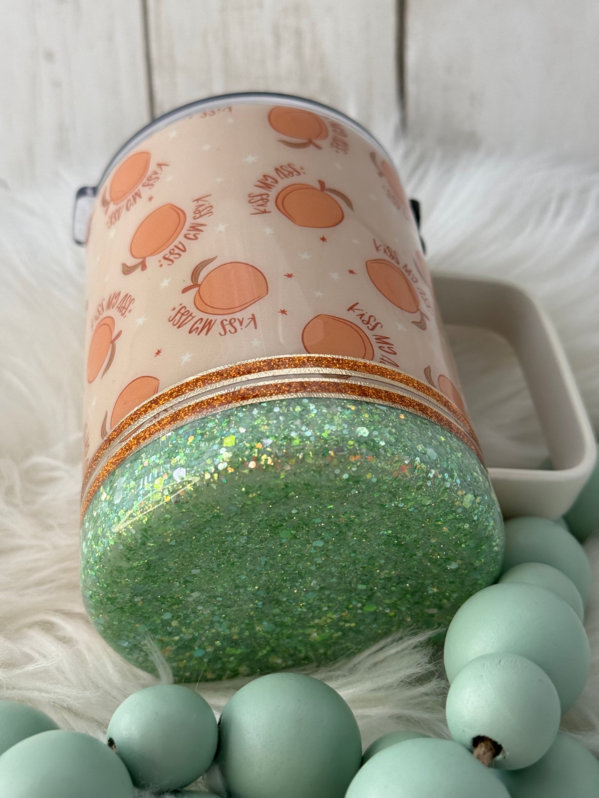 Adorned with beige polka dot vinyl and soft peach accents, it proudly displays your new favorite morning phrase in elegant script. The Granny Smith apple green glitter adds a lively sparkle that brightens both your mug and your mood. Finished with orange and textured gold vinyl details, this charming piece turns every sip into a moment of joy.