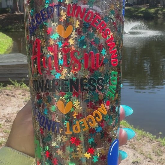 Celebrate love, understanding, and inclusion with this Autism Awareness 20 oz Snow Globe Tumbler 🧩✨. Filled with shimmering glitter and miniature puzzle pieces, this design beautifully captures the spirit of awareness and support.