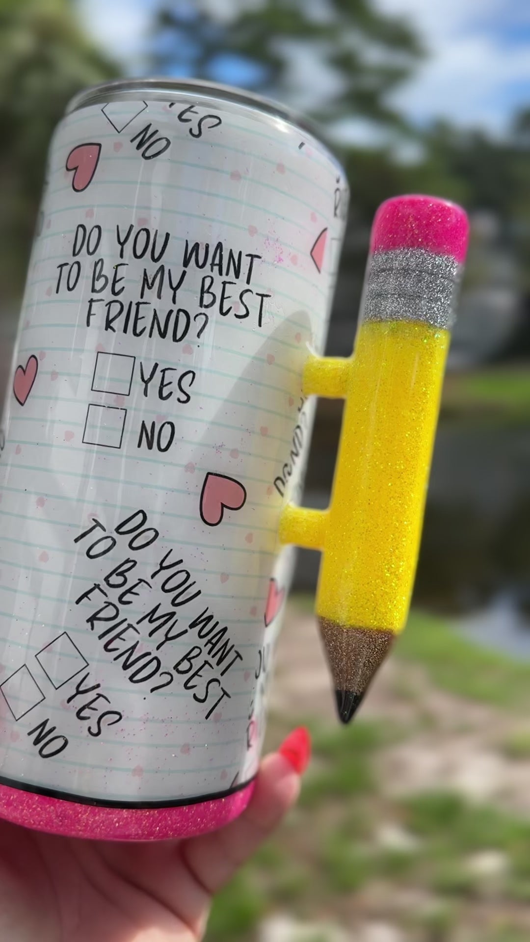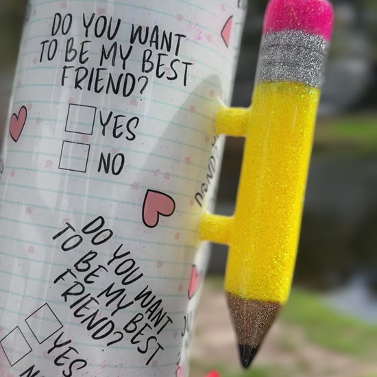 Brighten someone’s day with this adorable “Will You Be My Best Friend?” tumbler ✨. Featuring a charming 3D pencil handle, immense sparkle, and beautifully coordinated colors, this 20 oz tumbler blends heartfelt sentiment with irresistible style. The glitter finish and playful design make it a perfect gift for teachers, friends, or anyone who loves a little extra shine.