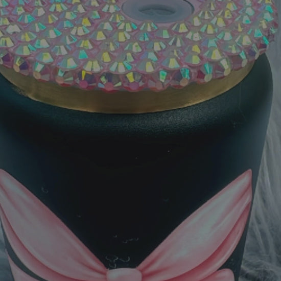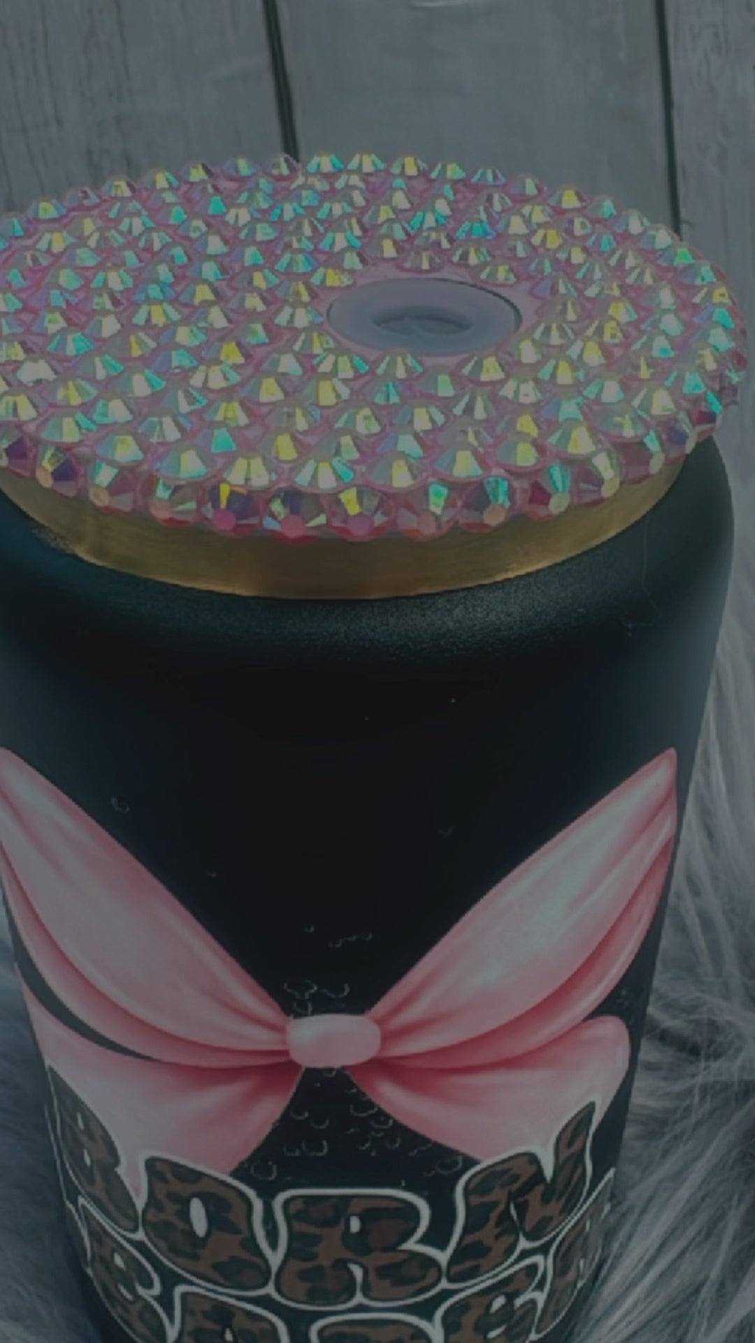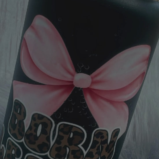 This striking design features a sleek black matte finish with “Born Leader” written in bold leopard print, perfectly balancing power and style. It is adorned with a soft pink bow and finished with a gold rim for a touch of elegance. The look is completed with baby pink rhinestones on the lid, adding just the right amount of sparkle to match your unstoppable energy.