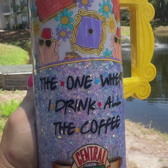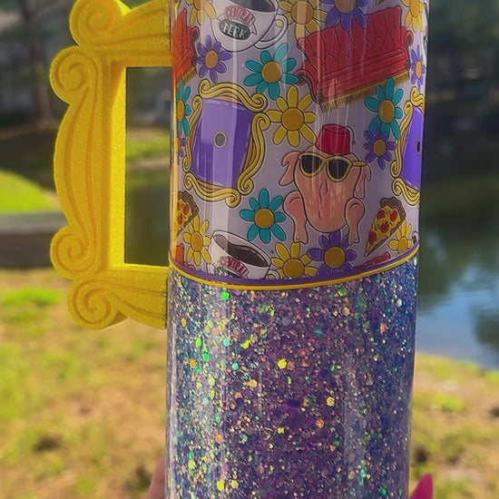 This tumbler features gorgeous purple glitter that shimmers beautifully, giving all the Pal vibes you could ask for. The vinyl wrap is designed with all the familiar details that remind you of your favorite coffee spot. Purple and yellow vinyl striping add a fun, coordinated touch, while the picture frame handle finishes the look perfectly — charming, distinctive, and effortlessly stylish.