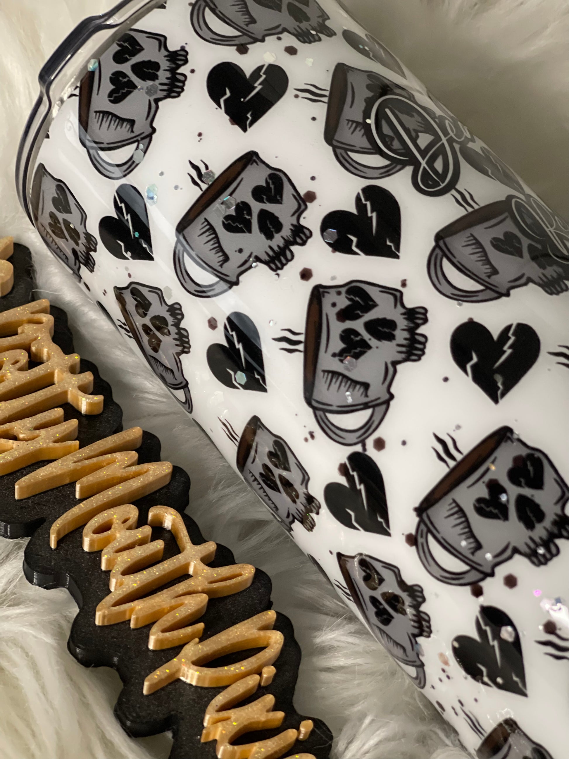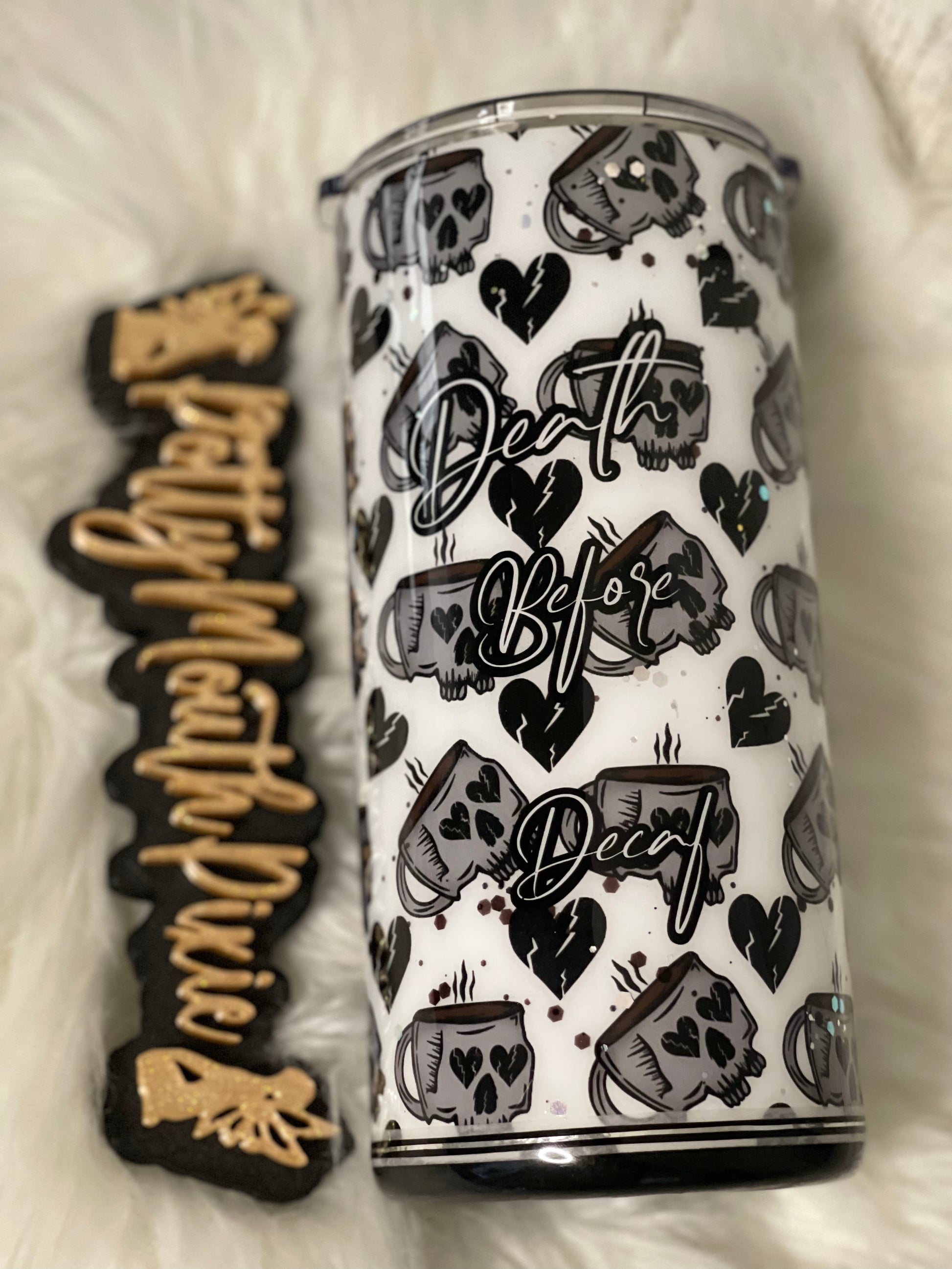 Designed with a bold black-and-white motif, this tumbler features a skull coffee mug–themed vinyl that perfectly captures its rebellious charm. The phrase “Death Before Decaf” is showcased in silver and black vinyl, creating a sleek contrast against the monochrome background. Subtle hints of silver glitter add just the right amount of shimmer for a darkly elegant finish.