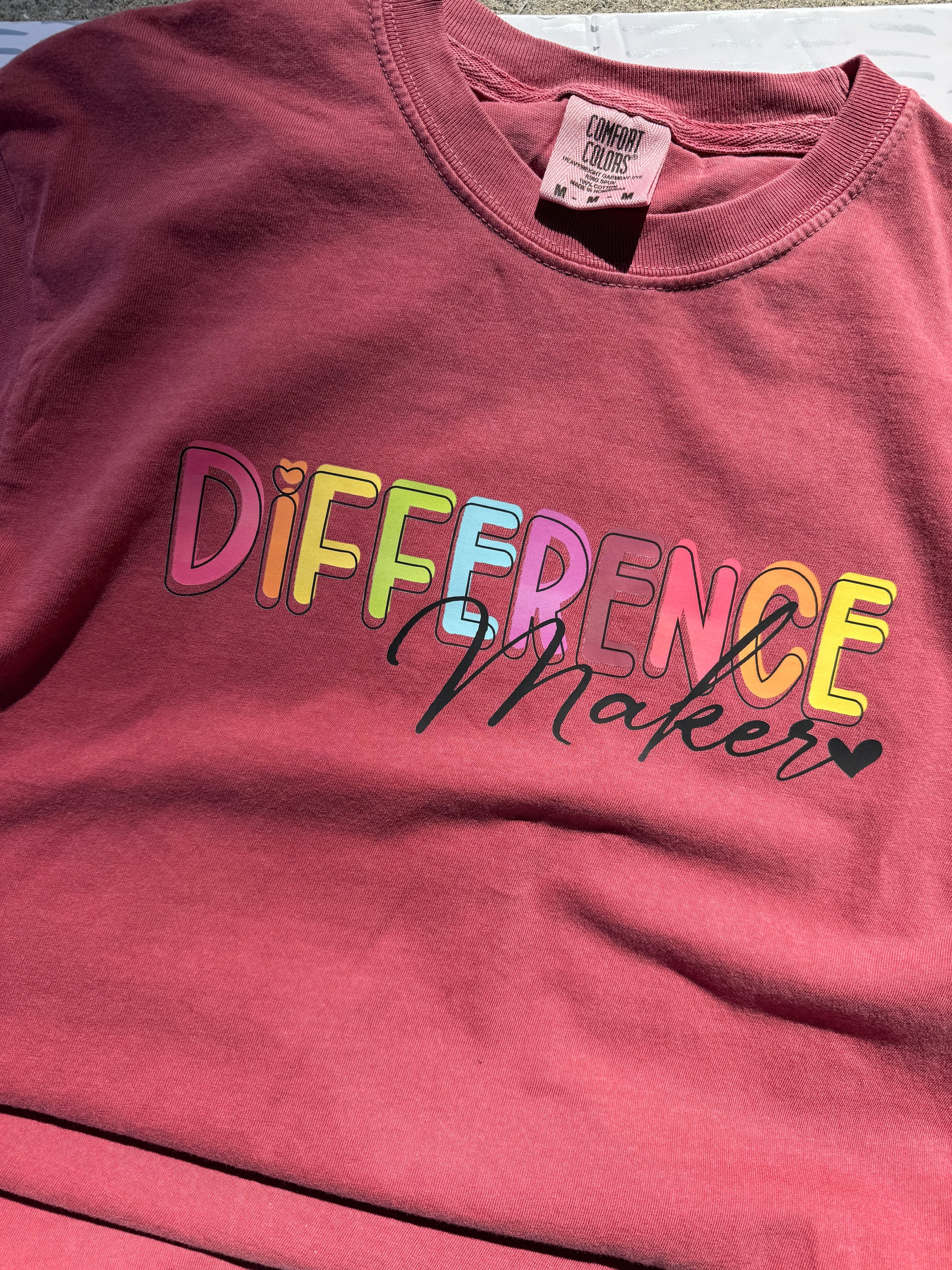 This medium burgundy t-shirt features the inspiring phrase “Difference Maker” in a vibrant, eye-catching design. “Difference” is written in multiple bright colors with subtle black shadows to make it pop, while “Maker” appears in elegant black script, finished with a sweet little black heart. A bold and uplifting tee perfect for anyone who strives to make a positive impact every day. 💖✨