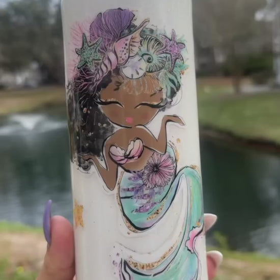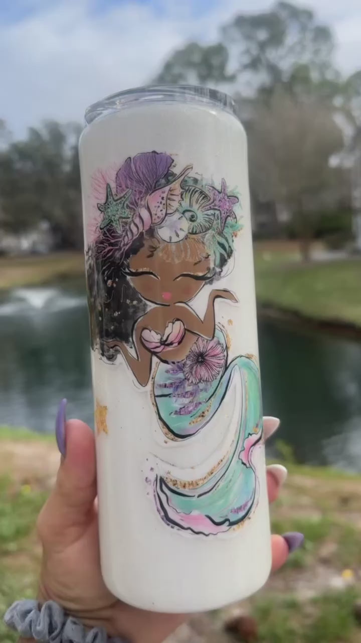 Make a splash with this magical Melanated Mermaid Girl 20 oz stainless steel tumbler, featuring a beautiful mermaid of color alongside her adorable sea creature friends โ a sweet seahorse and a gentle sea turtle. Perfect for ocean lovers, little dreamers, and those who want representation with their hydration!