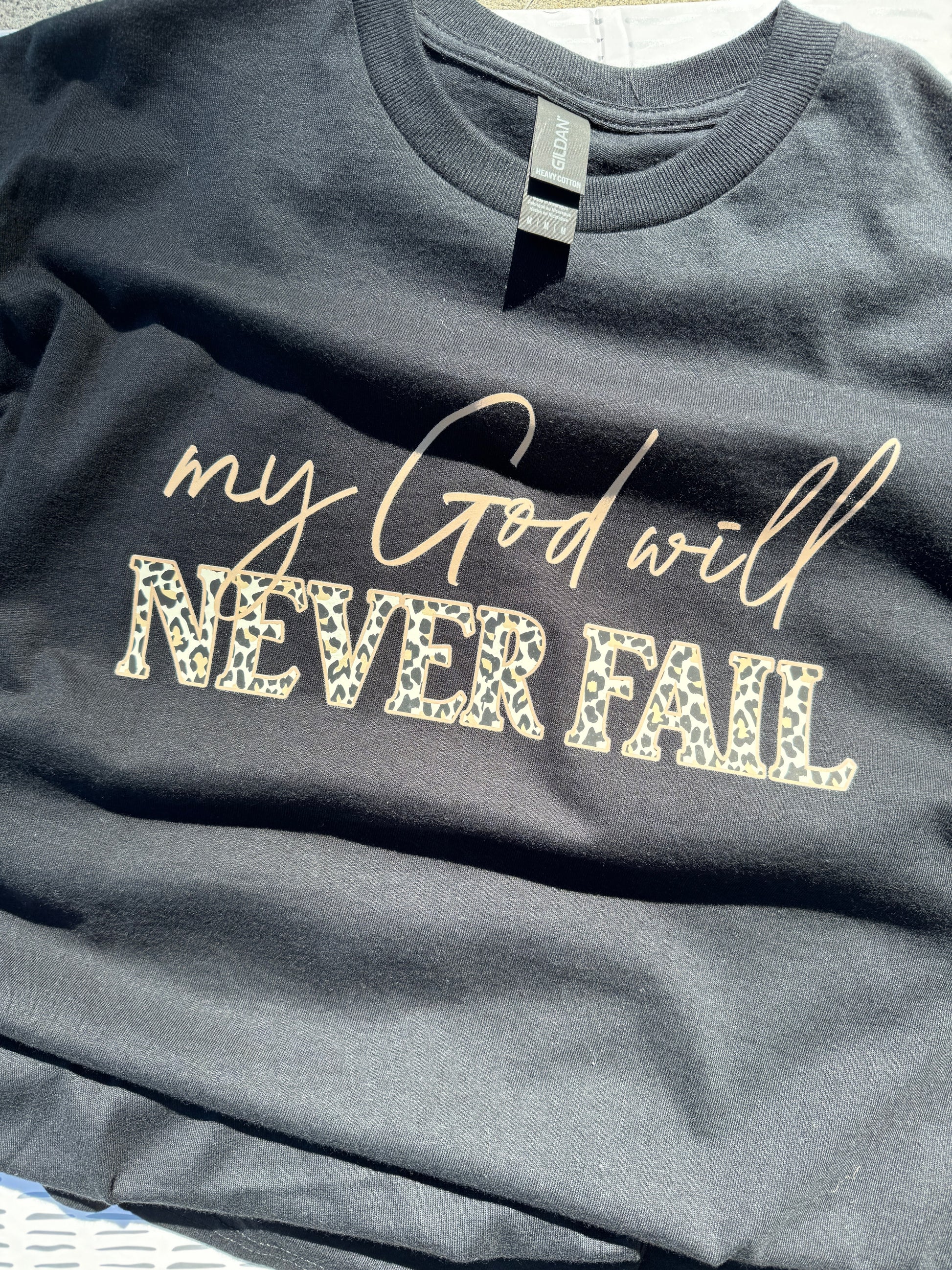 This medium black t-shirt features the empowering phrase “My God Will Never Fail.” “My God Will” is written in soft light beige, while “Never Fail” pops in bold leopard print. A stylish and faith-filled tee that makes a statement of trust, strength, and confidence. ✨🖤