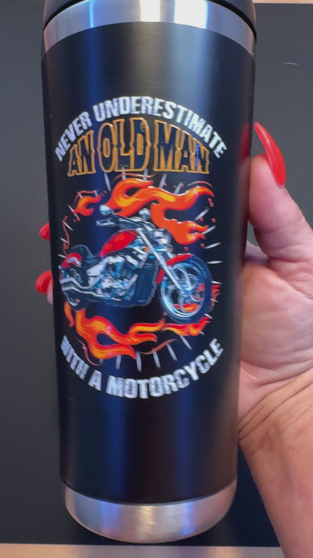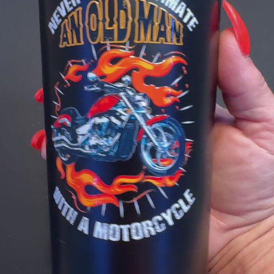 Show off your humor and love for the open road with the “Never Underestimate an Old Man with a Motorcycle” 20oz Tumbler — bold, funny, and built for riders. 🏍️🔥