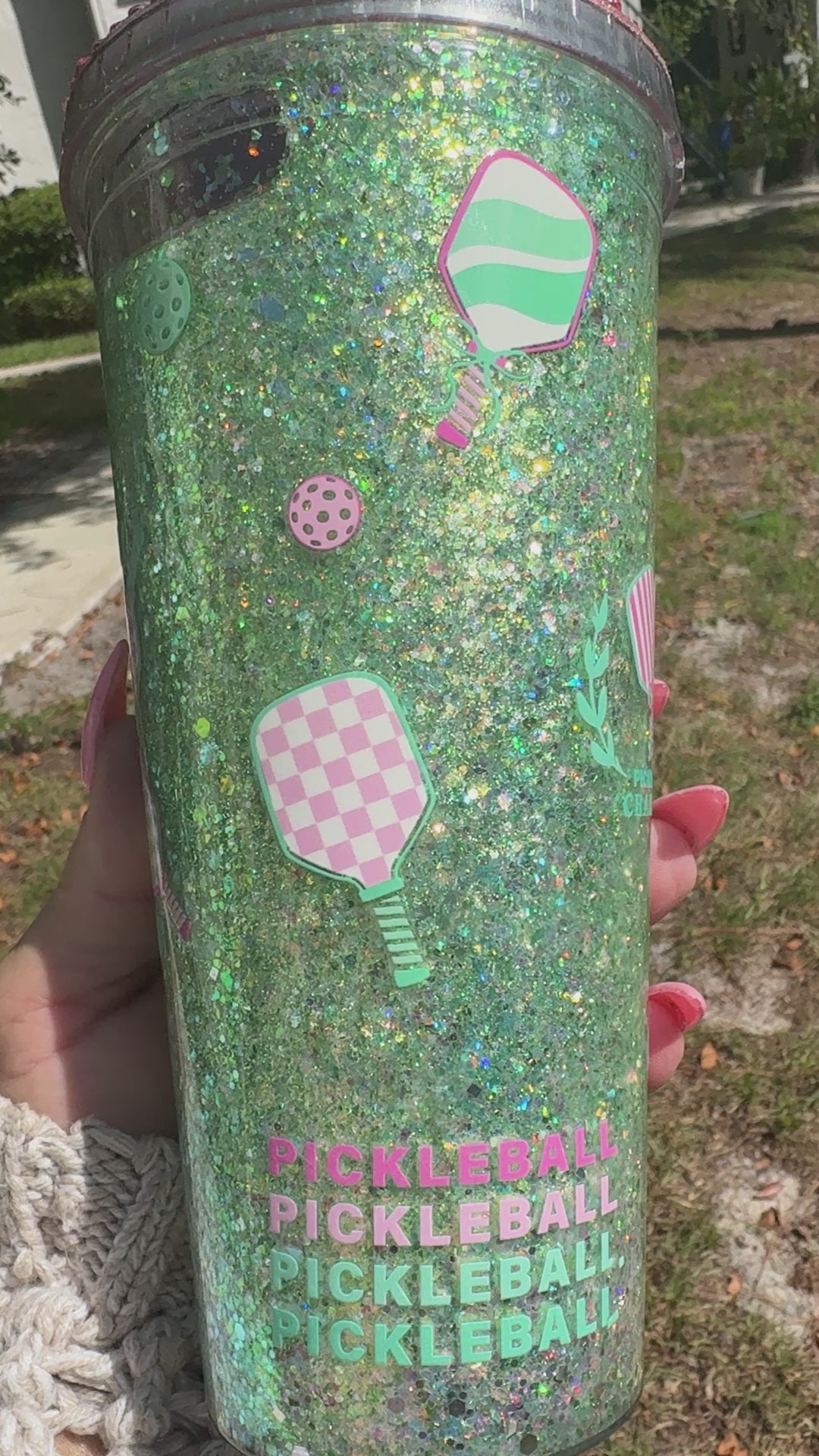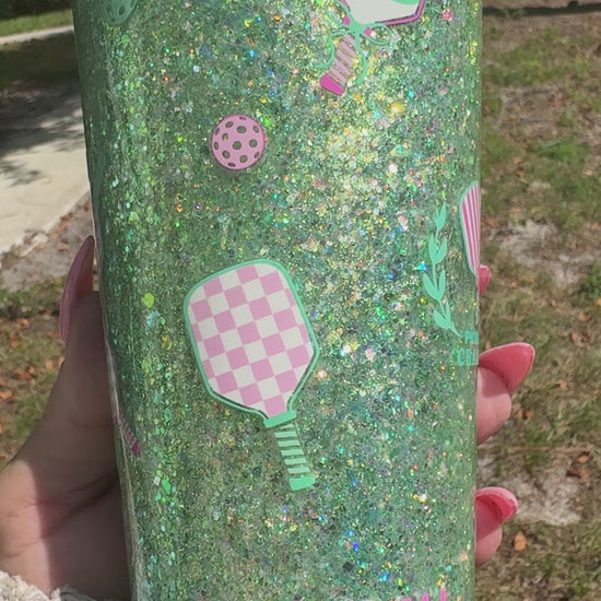 Serve up sparkle with this Pickleball 24 oz Snow Globe Tumbler 🏓✨. Wrapped in fun and colorful pickleball-themed images, this tumbler is a must-have for anyone who loves the game and a bit of glam.