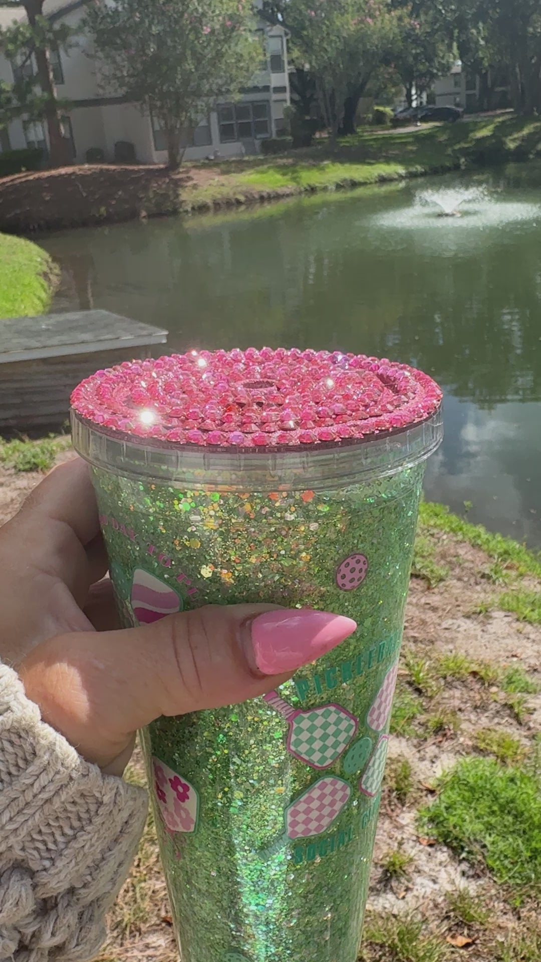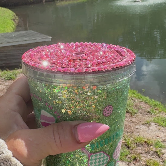 Filled with vibrant green glitter that swirls beautifully, it perfectly matches the playful design. Finished with dazzling hot pink rhinestones on the lid, this snow globe tumbler brings energy, style, and personality to every sip—on or off the court.
