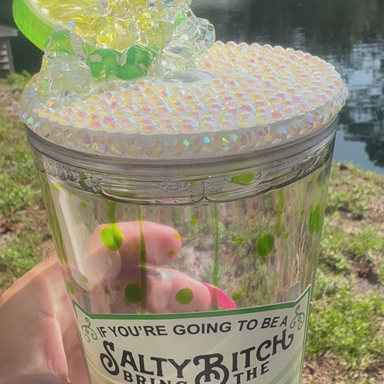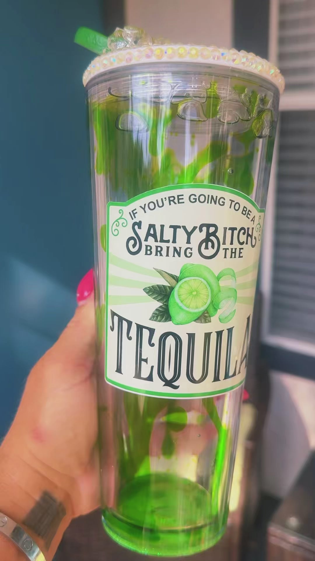 This eye-catching tumbler features a Salty Bitch Tequila decal and is filled with a mesmerizing lava lamp–like solution that shimmers and flows with every movement. The look is topped with beautiful pearl-like rhinestones, finished off with realistic ice details and a playful lime accent for that perfect tropical vibe.