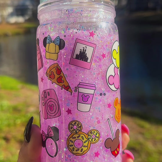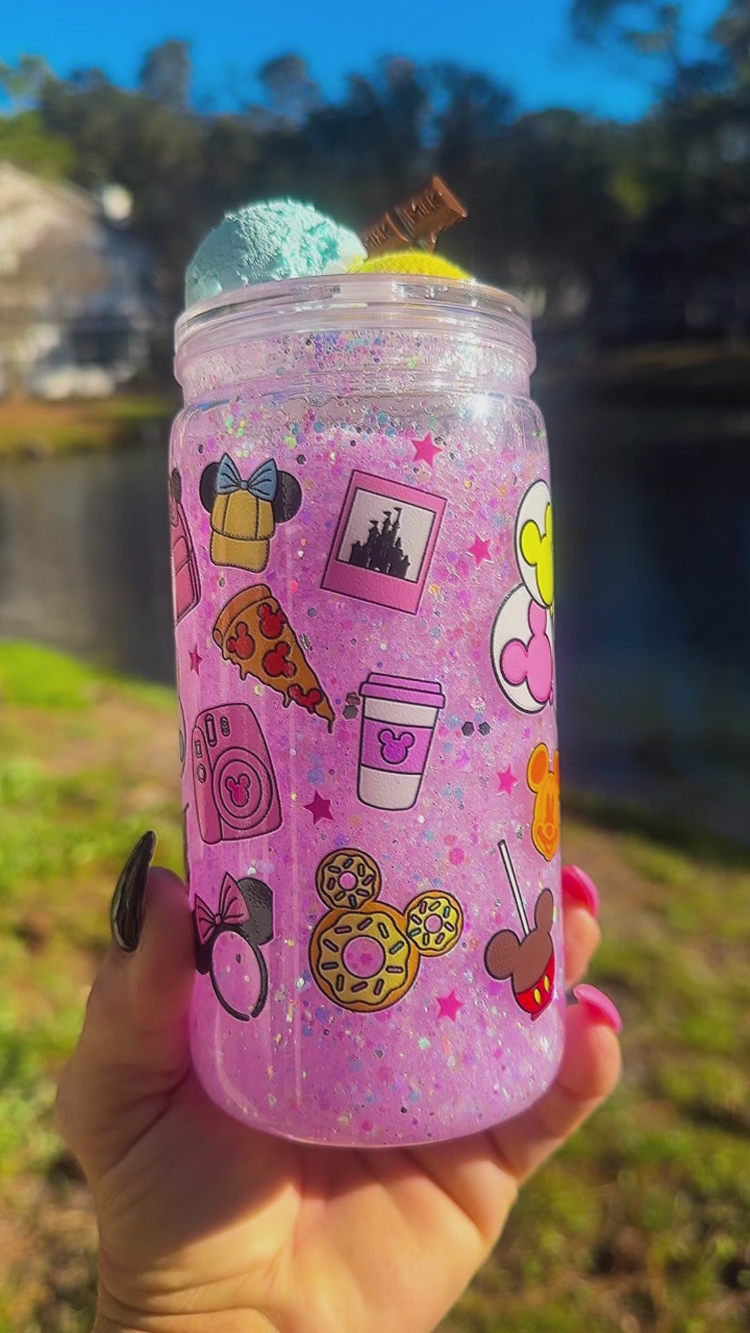 The body shimmers with stunning pink glitter, creating the perfect backdrop for the nostalgic design. It is topped with realistic ice cream scoops and a chocolate bar, adding a delightful 3D touch that makes this tumbler truly one-of-a-kind.