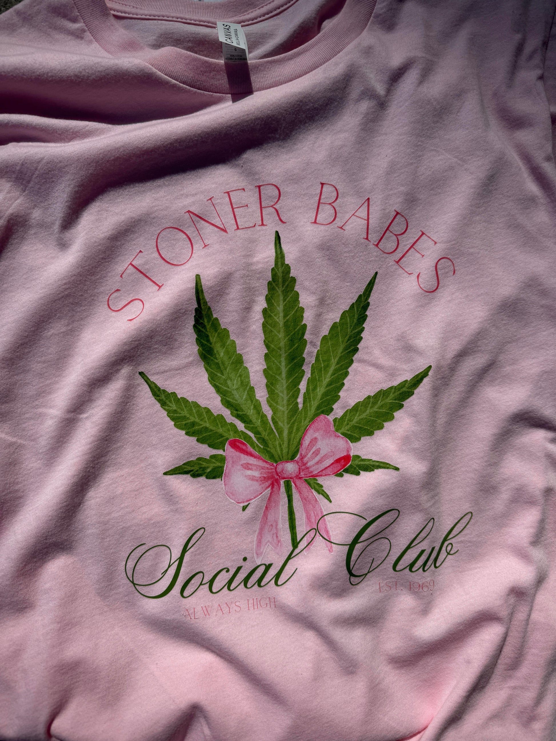 This large soft pink t-shirt channels laid-back, good-vibes energy with the “Babes Social Club” design, featuring a beautiful green leaf adorned with a pink bow. Perfect for those who love a relaxed style with a playful, girly twist. 🌿🎀