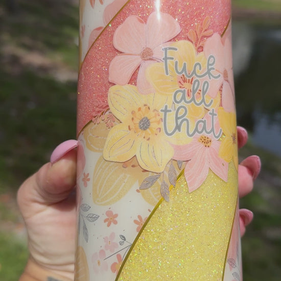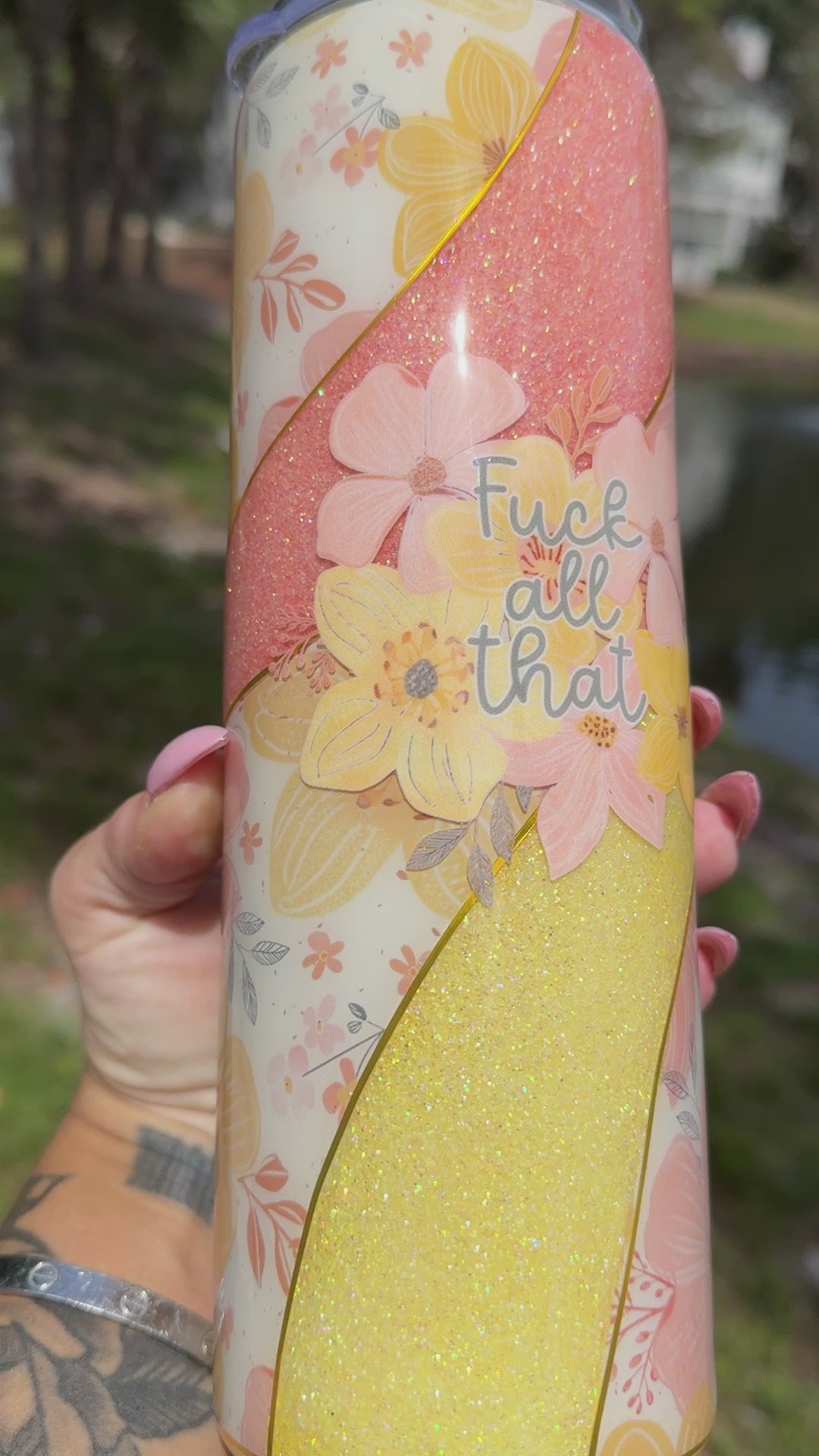 Make a statement with this stunning 30 oz tumbler featuring a delicate floral design accented by sparkling peach and yellow glitter ✨. The soft, complementing colors create an elegant contrast between charm and attitude, making it a perfect mix of pretty and bold.